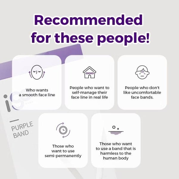 Purple Band verhilft Ihnen zu einer schönen Gesichtsform und einem schönen Dekolleté. Es kann 3-4 Mal pro Woche ohne Vorbehandlung angewendet werden. Dank des Saunaeffekts des Bio-Neoprens, der die Körpertemperatur erhöht, lässt es sich problemlos zu Hause anwenden.